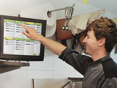 Der Küchenchef arbeitet interaktiv mit den Kellnern. Status über Zubereitung und Ergänzung von Produkten.